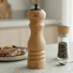 Este molinillo utiliza un mecanismo de doble etapa que primero corta el grano de pimienta y luego lo muele, liberando los aceites esenciales para un aroma máximo. El sistema de ajuste en la base permite seleccionar desde un polvo extra fino hasta un triturado grueso para carnes. Cuerpo de madera de haya certificada PEFC con acabado en barniz mate protector.